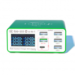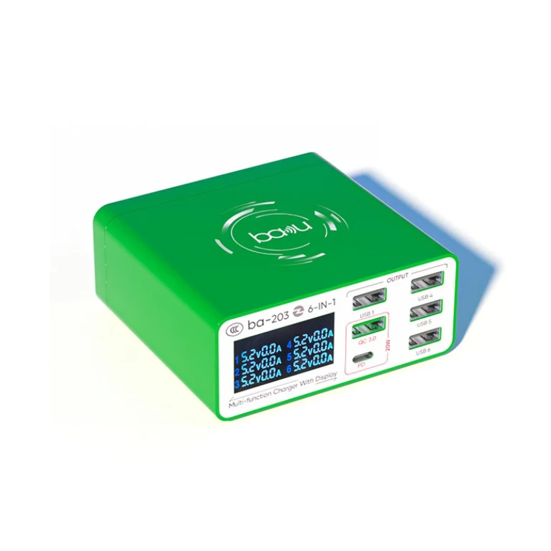 El BA-203 es un cargador multipuerto 6 en 1 que permite conectar y cargar varios dispositivos USB al mismo tiempo desde una sola toma de corriente, con soporte para protocolos de carga rápida y múltiples sistemas de seguridad integrados.