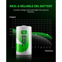 La batería recargable EBL 10000mAh 1.2V Size D es una batería de níquel e hidruro metálico (Ni-MH) diseñada para dispositivos de alto consumo energético. Ofrece una gran capacidad de carga y ciclos de recarga duraderos, ideal para linternas, radios, juguetes eléctricos y equipos de emergencia.