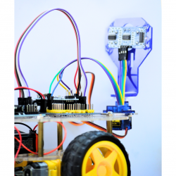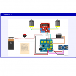 El carrito utiliza un sensor ultrasónico HC-SR04, controlado por la librería NewPing. Este sensor emite ondas ultrasónicas y mide el tiempo que tardan en regresar después de rebotar en un objeto, calculando así la distancia al obstáculo en centímetros. El sensor está montado sobre un servomotor, que le permite girar para mirar al frente, a la derecha o a la izquierda. De esta forma puede explorar el entorno y determinar qué dirección está más despejada