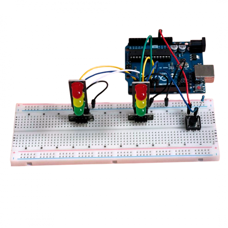 Simula un semáforo vehicular (rojo, amarillo y verde) y uno peatonal.