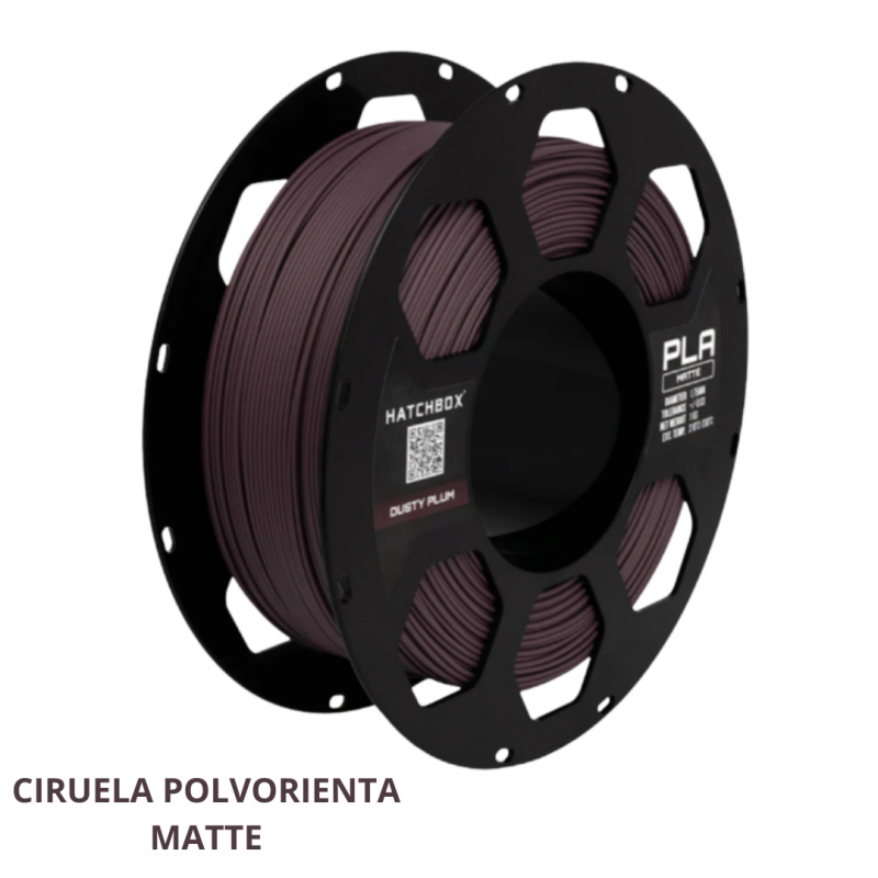 El Filamento PLA Hatchbox Matte Ciruela Polvorienta (Dusty Plum) es un material termoplástico de origen vegetal utilizado en impresión 3D, con acabado mate y color ciruela apagado. Está diseñado para facilitar la impresión y ofrecer un resultado estético sin brillo.